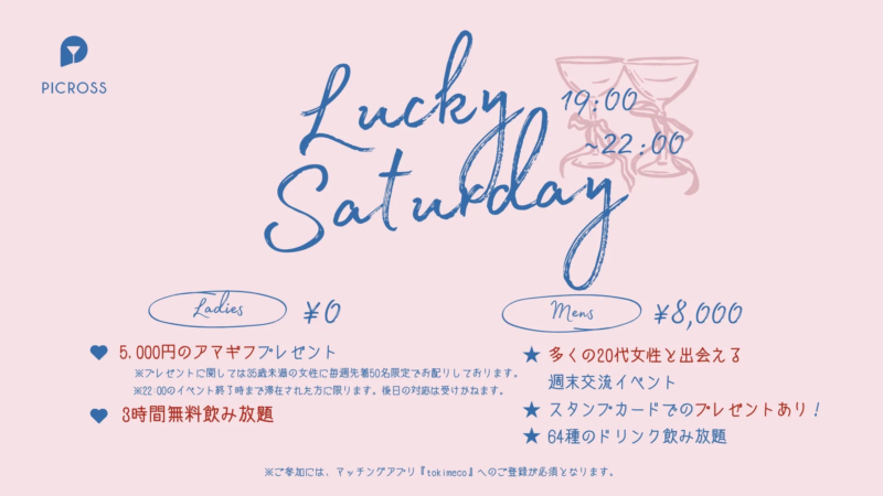 週末はPICROSSの『Lucky Saturday』で、新しい出会いと楽しい時間を過ごしてみてはいかがでしょうか?