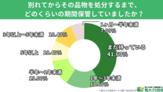 まず、最も驚くべき結果として、別れてからその品物を処分するまでの期間について尋ねたところ、「まだ持っている」と回答した人が41.6%にも上ったそうです。これは最も多い回答であり、多くの人が思い出の品を長く手元に残していることがわかります。