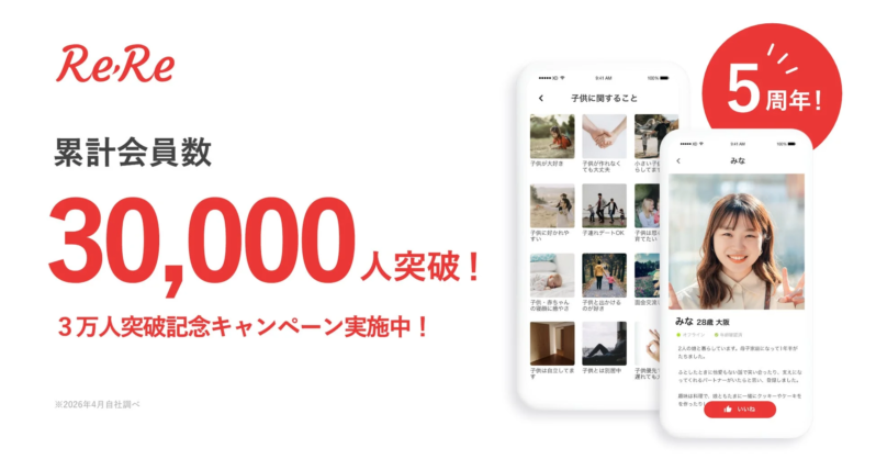 「ReRe」は、そうした方々の悩みに寄り添い、「子供がいる方(同居問わず)」と「子供がいる人も恋愛対象という方」をつなげることに特化したマッチングアプリです。子供がいる方が「自分を100%受け入れてもらえる」と安心して出会える場を提供し、「一人でも多くの方が理解者と出会えるようになってほしい」という思いで運営されているとのこと。